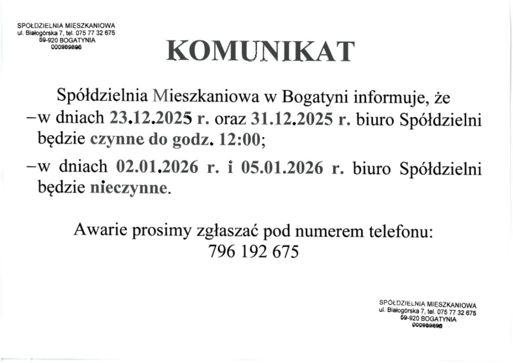 Komunikat – dni pracy SM w okresie Świąt Bożego Narodzenia